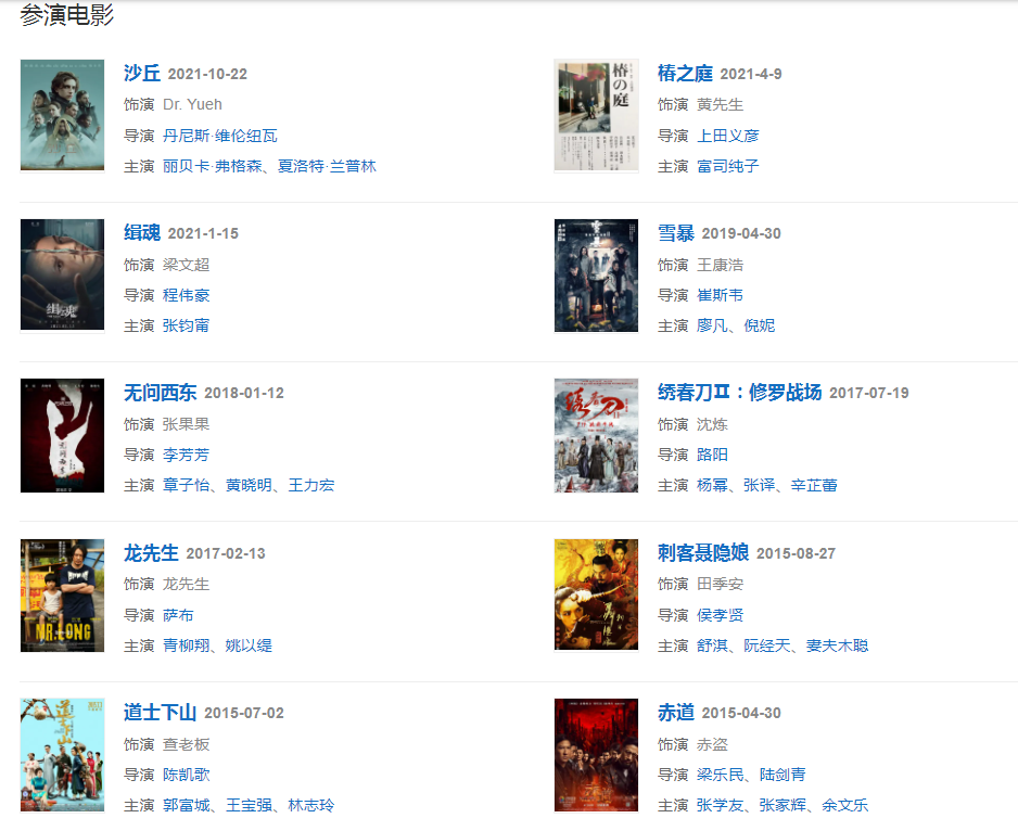 2009年,因出演功夫電影《一代宗師》中一線天一角而受到廣泛關(guān)注。